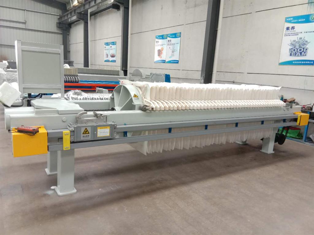 濾板內(nèi)側(cè)有孔供排出濾液和吹氣,濾室襯著濾布。濾布在過濾時處于高位,缺餅時處于低位,起落由一些液壓柱構(gòu)成機械手操作。每個壓濾周期分為五個階段: